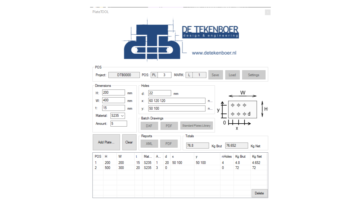 Met dit gereedschap kan je een tekening van een vierkant plaat genereren klaar voor het laser/plasmasnijden met gaten en POS informatie. Snij laag 7 (WIT), arcering laag 2 (ROOD).