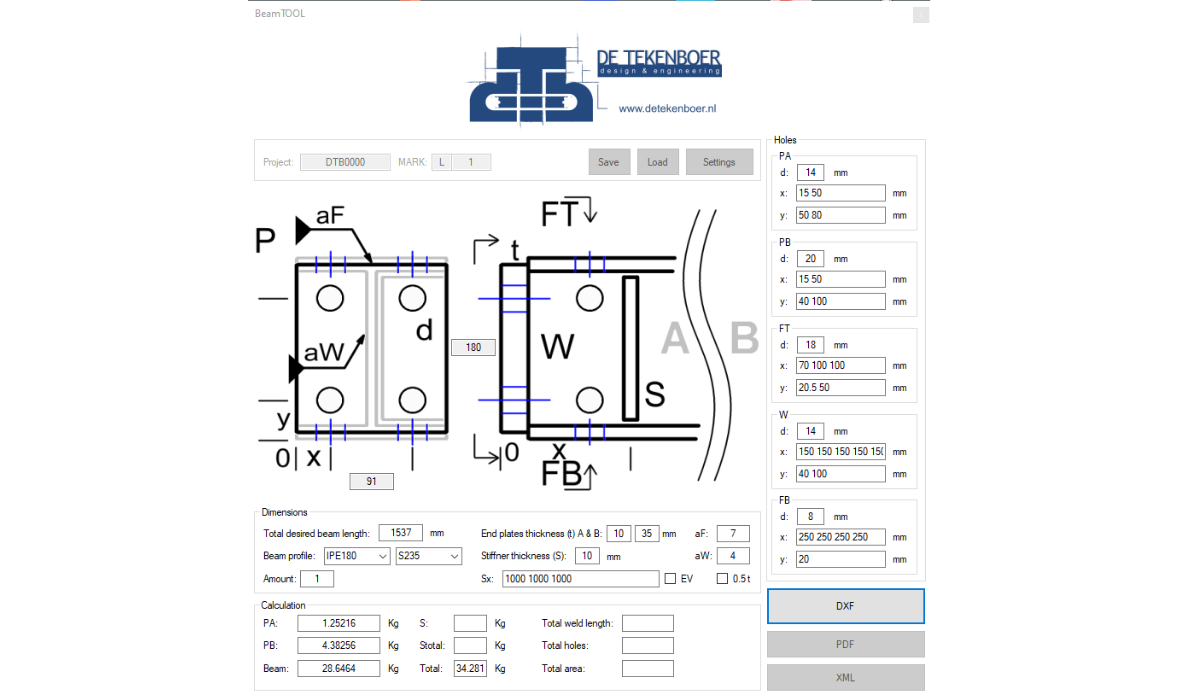 Met dit gereedschap kan je een tekening van een balk genereren met kopplaten, schotten en gaten in het lijf en flensen.